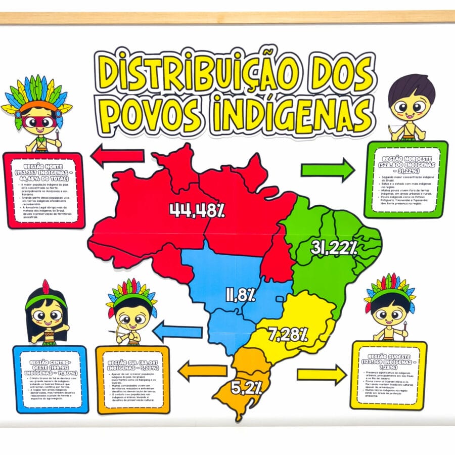 Com um mapa colorido destacando as porcentagens de presença indígena em cada região do país, o painel é ideal para complementar conteúdos de História e Geografia. Além disso, acompanha breves descrições que trazem curiosidades culturais e históricas sobre os povos de cada área, promovendo a valorização da cultura indígena e sua importância para o Brasil.